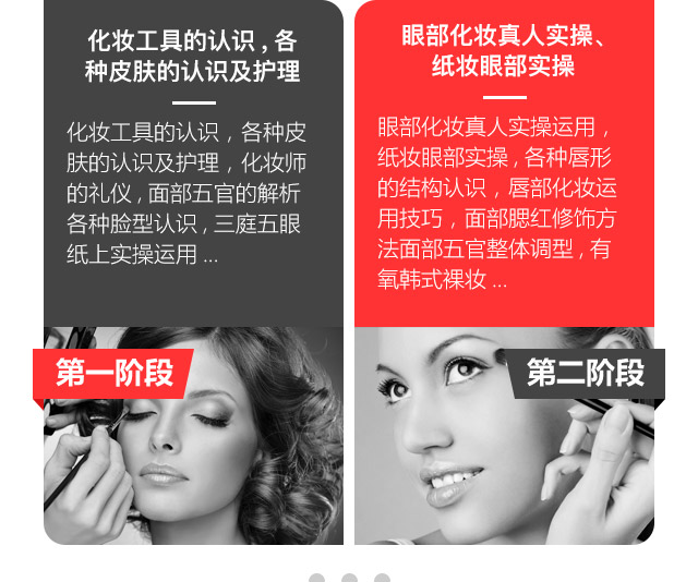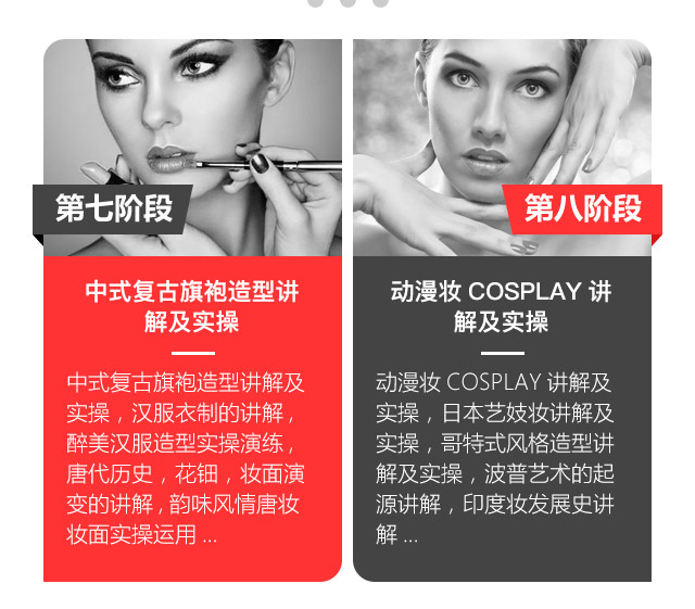 课程介绍:此专业针对无任何基础的学员,学习国际上最流行的T台潮流妆,影视妆、新娘,晚宴妆,老人妆,特技妆,幻彩妆等等,毕业后可以独立完成、设计整体化妆造型,是短期培训中最全面的化妆课程,同时也是考取国家高级证的必修课程。