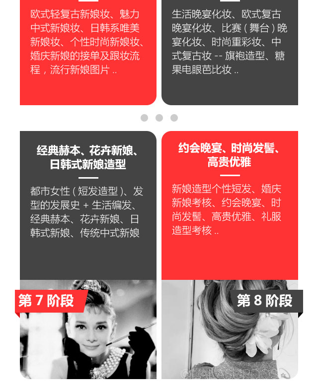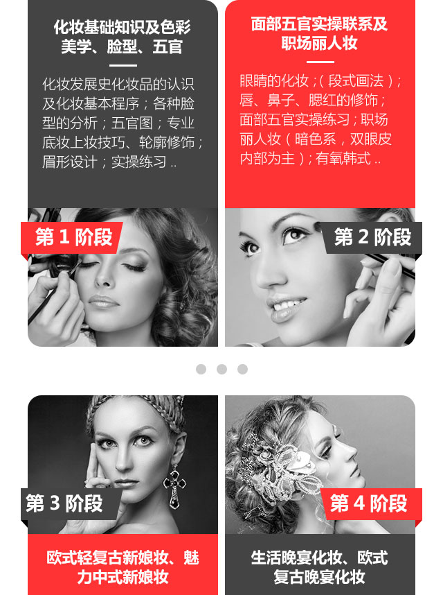 课程介绍:此课程是针对无任何基础的学员,学习国际上最流行的有氧裸妆·生活装·及各种风格的新娘妆,晚宴妆,烟熏妆·幻彩妆。此课程是“曹琼”学院特色套餐课程之一,为了塑造国际顶尖形象设计师而开设的。针对无任何基础的学员,包括《时尚造型师》·《专业化妆师班》。以及各种晚装技术、解释晚装三维原理及点、线、面的立体造型学习晚装的基本手法、设计理念和审美观点、运用包、盘、叠、堆、扎、辫、编、拎、扭、片状、波状、手拉花等方式。学内容实用化·时尚化、前沿化、国际化。内容:《时尚造型师》+《专业化妆师班》
